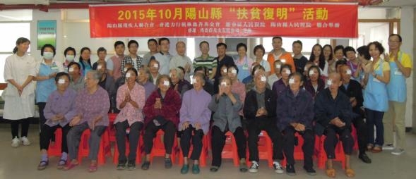 2015年9月6日至9日,新會區人民醫院醫療隊聯同陽山縣殘疾人聯合會人員,及香港力行植林慈善基金會義工走訪了陽山縣6個鄉鎮,共為907人進行檢查,其中有281人是白內障成熟,需要手術治療。醫療隊排除身體有其他疾病,暫不適宜手術患者(例如:肺或氣管、心臟有嚴重疾病,血壓或血糖超高嚴重),即場發出預約手術通知書160份給符合手術條件的白內障患者,以及15份預約胬肉手術患者。